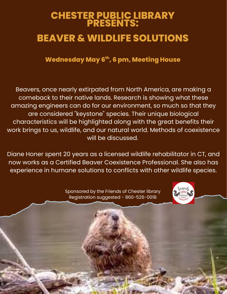 Beaver and Wildlife Solutions Wednesday, May 6, 2026 6:00 PM 7:00 PM 18:00 19:00 Google Calendar ICS Presenter, Diane Honer spent 20 years as a licensed wildlife rehabilitator in CT, and now works as a Certified Beaver Coexistence Professional. She also has experience in humane solutions to conflicts with other wildlife species.
