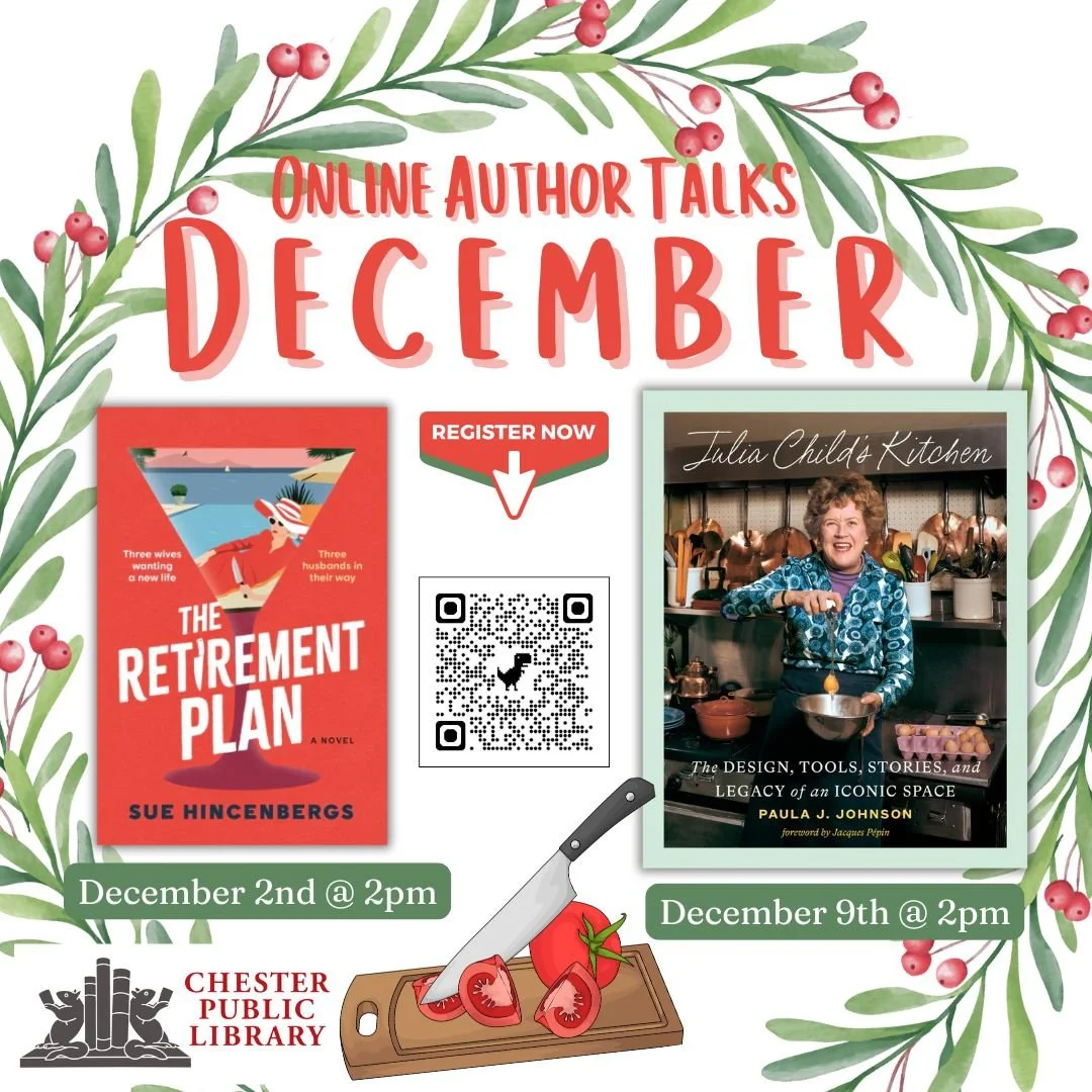 The free, virtual series takes place two to three times a month and includes the opportunity to ask questions to the author. A complete list of events is available on Chester Public Library’s virtual author talk series website at https://libraryc.org/chesterctlibrary. All events are free and open to the public.