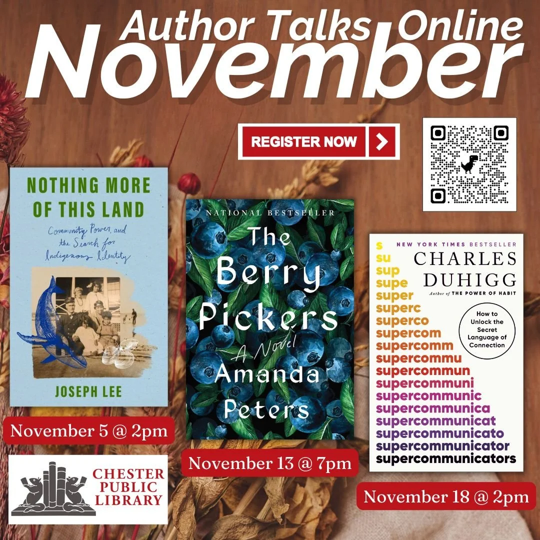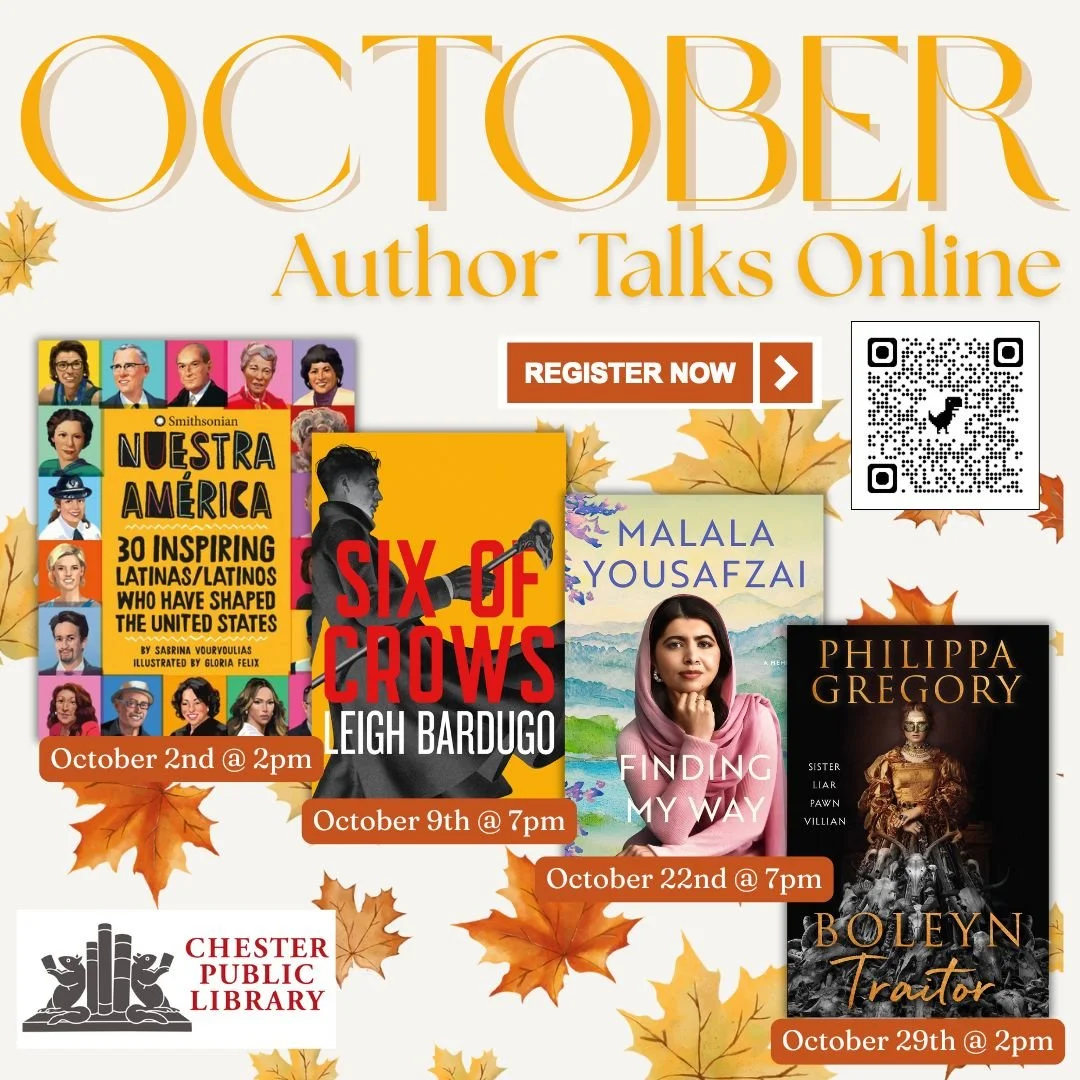 Chester Public Library showcases a virtual author talk series each month featuring bestselling, award-winning, and highly acclaimed authors from around the world. The featured writers and thought leaders will cover a wide range of fiction and nonfiction genres.